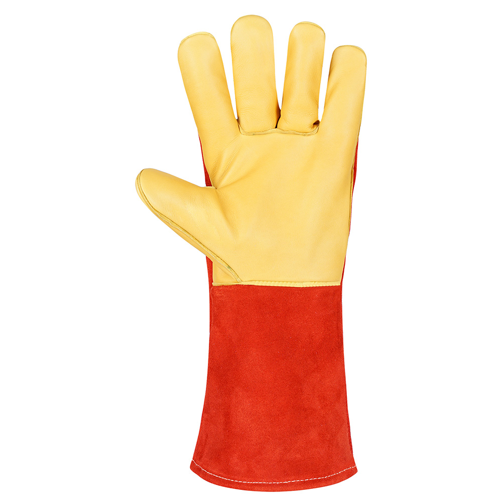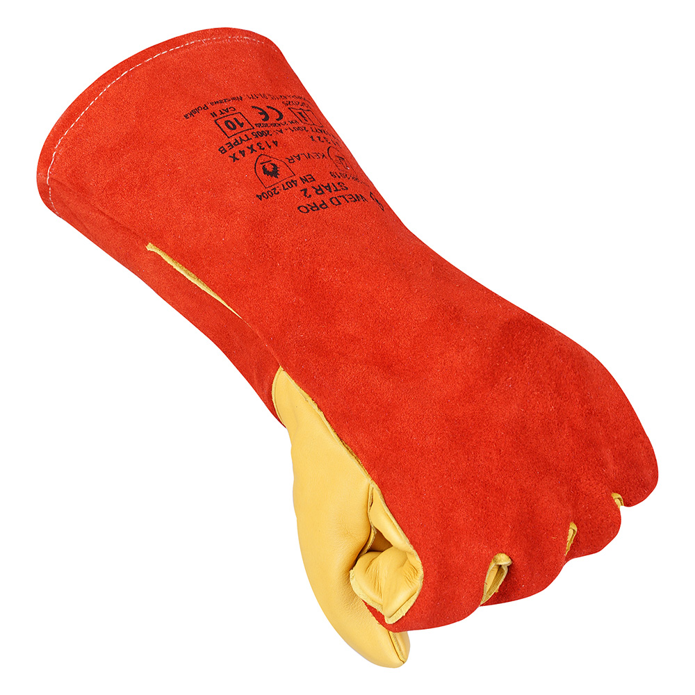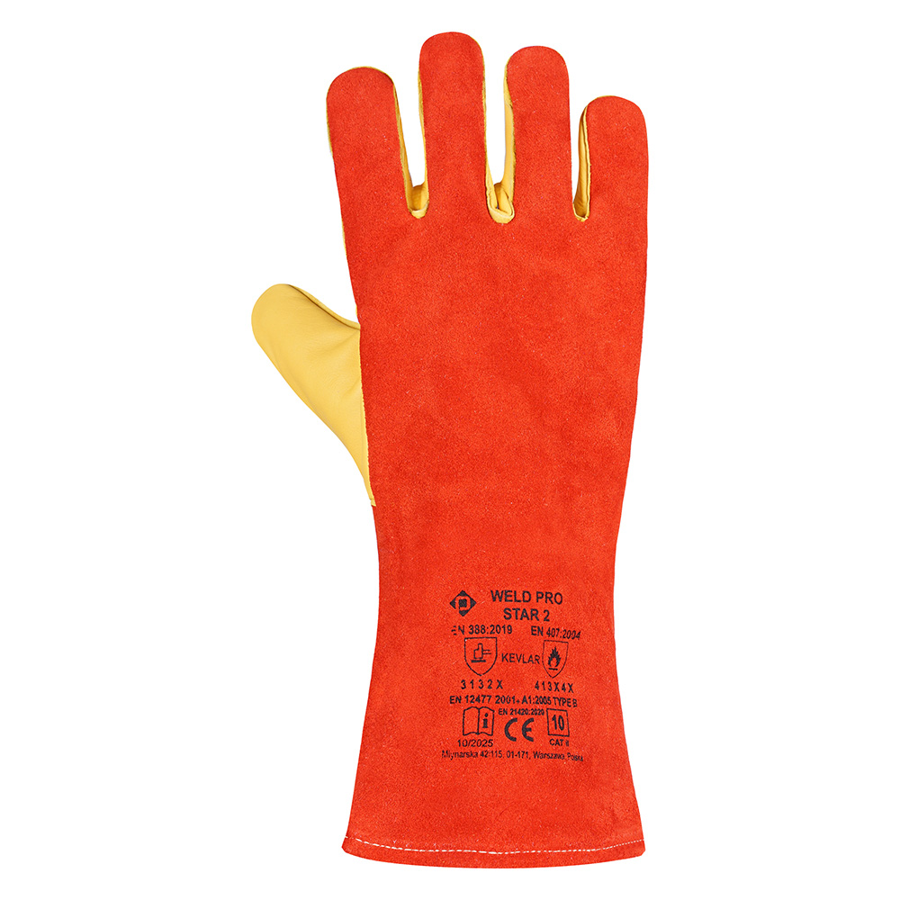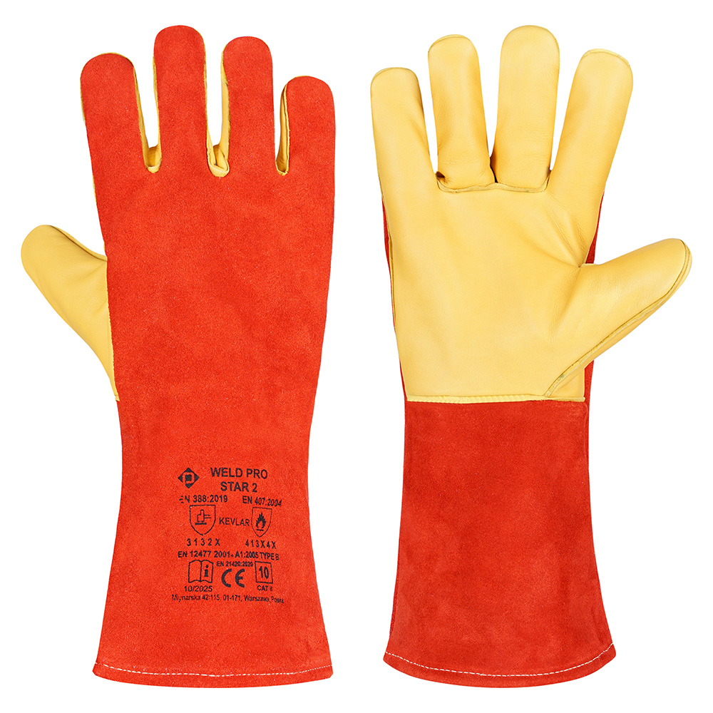WELD PRO STAR 2 - długie rękawice spawalnicze z dwoiny bydlęcej ze wzmocnieniem ze skóry licowej bydlęcej w części chwytnej oraz kciuku. Rękawice do spawania zapewniają ochronę przed odpryskami gorących metali oraz przed wysoką temperaturą.